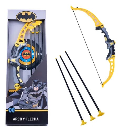 Set de arco y flechas inspirado en Batman.Incluye arco y flechas con ventosa.Ideal para juegos de puntería recreativos.Recomendado para uso bajo supervisión adulta.